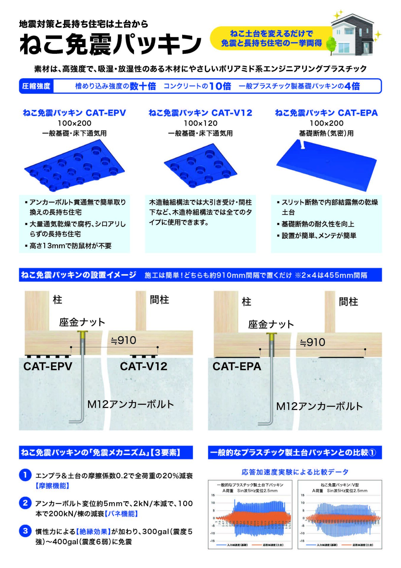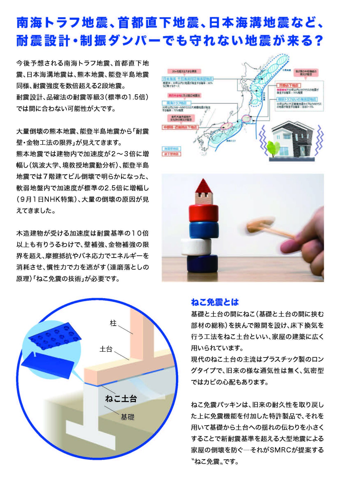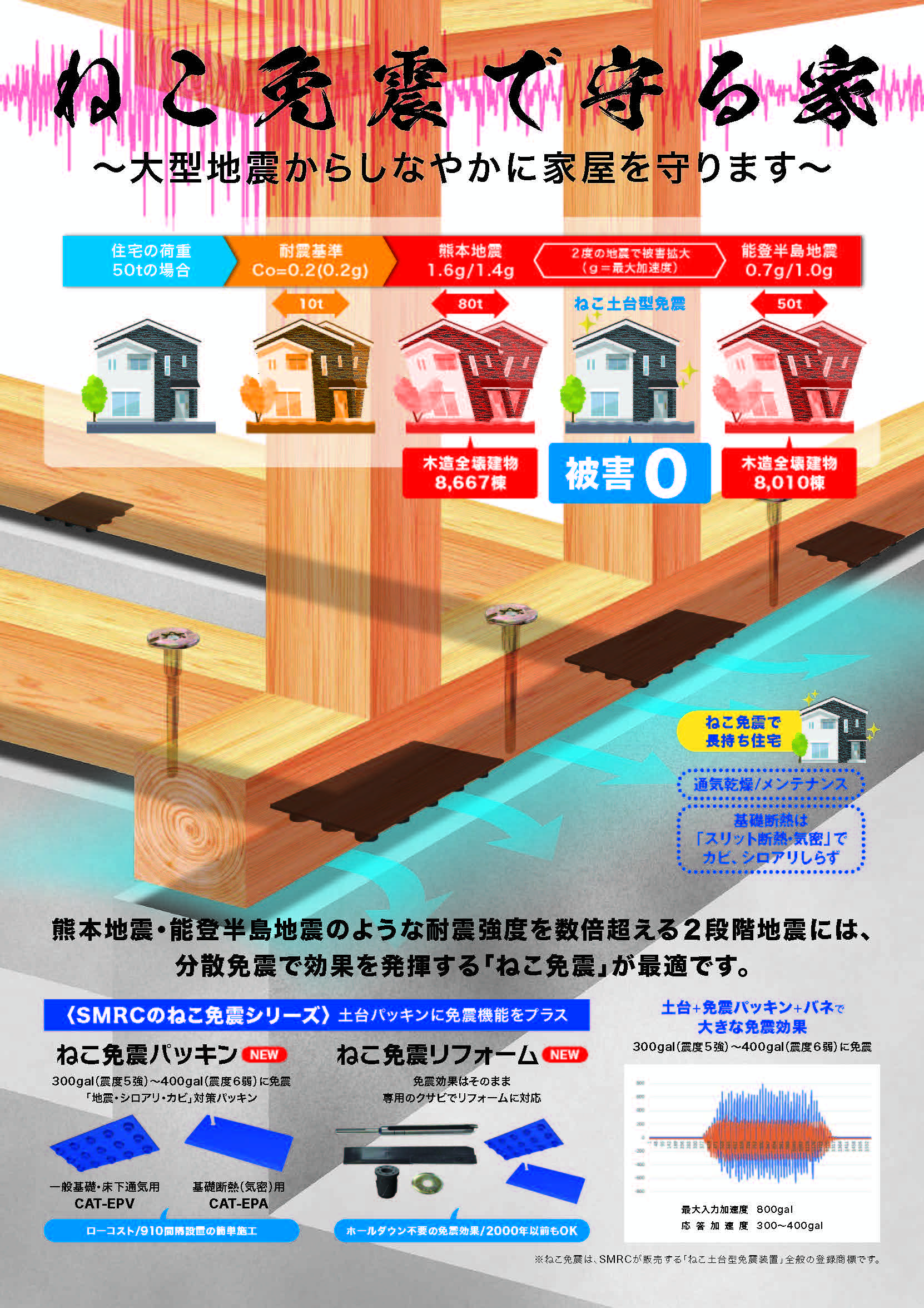 従来のねこの代わりに設置すると地震の際にスライド効果で揺れを逃がし摩擦でブレーキをかけ、大地震による家屋の倒壊を防ぎます。